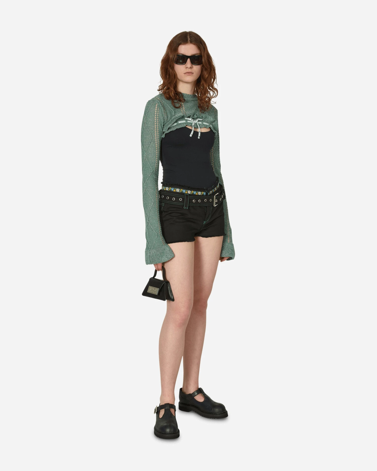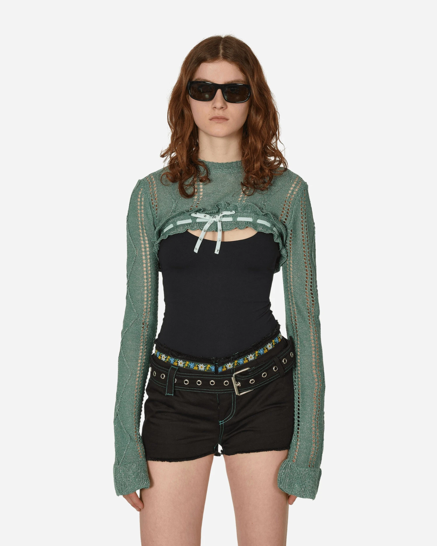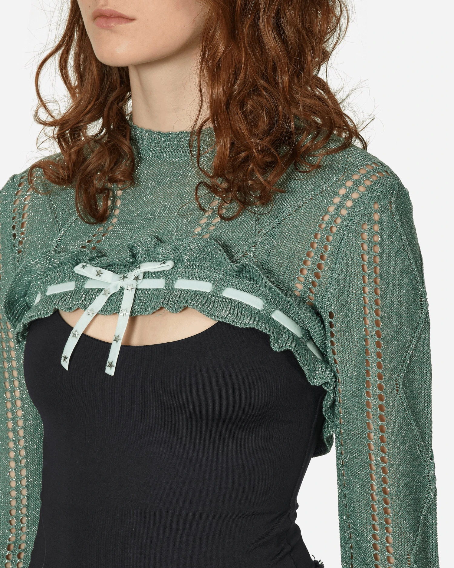 Jezabelle Cormio doesn’t love the conventional rules. Her life is a constant search for the unknown. Cormio is her brand, born in 2019, combining Tyrolean-Austrian mountain aesthetics and the folklore of the Italian urban bourgeoisie. The Annalisa glitter bolero knit features a round neck and lace detail with star-shaped studs.