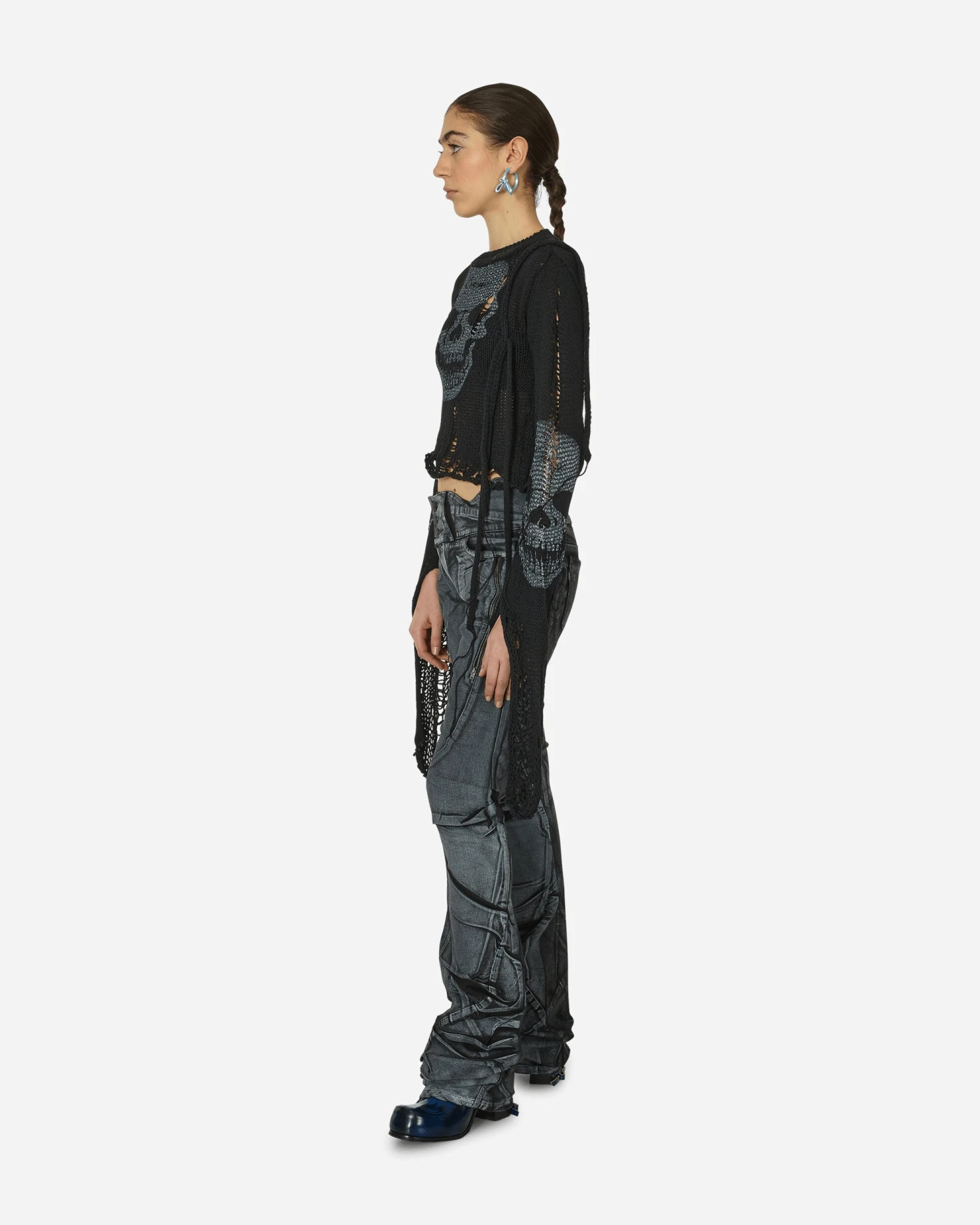This cropped distressed knit features skull print in contrasting colour on body and sleeves, distressed edges and extra long sleeve.