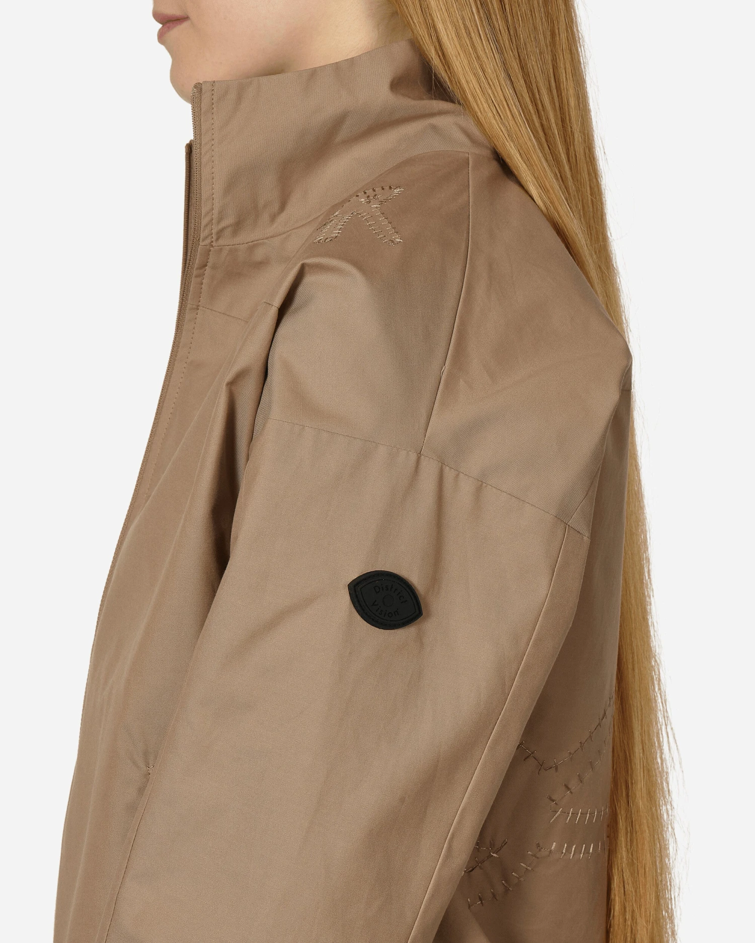 The hiking jacket is constructed from a blend of organic cotton and recycled polyester, and is treated with a non-PFC Durable Water Repellent finish for increased water resistance in inclement weather. The jacket features custom sewn patch logos, hand pockets, and a debossed badge on the left shoulder.